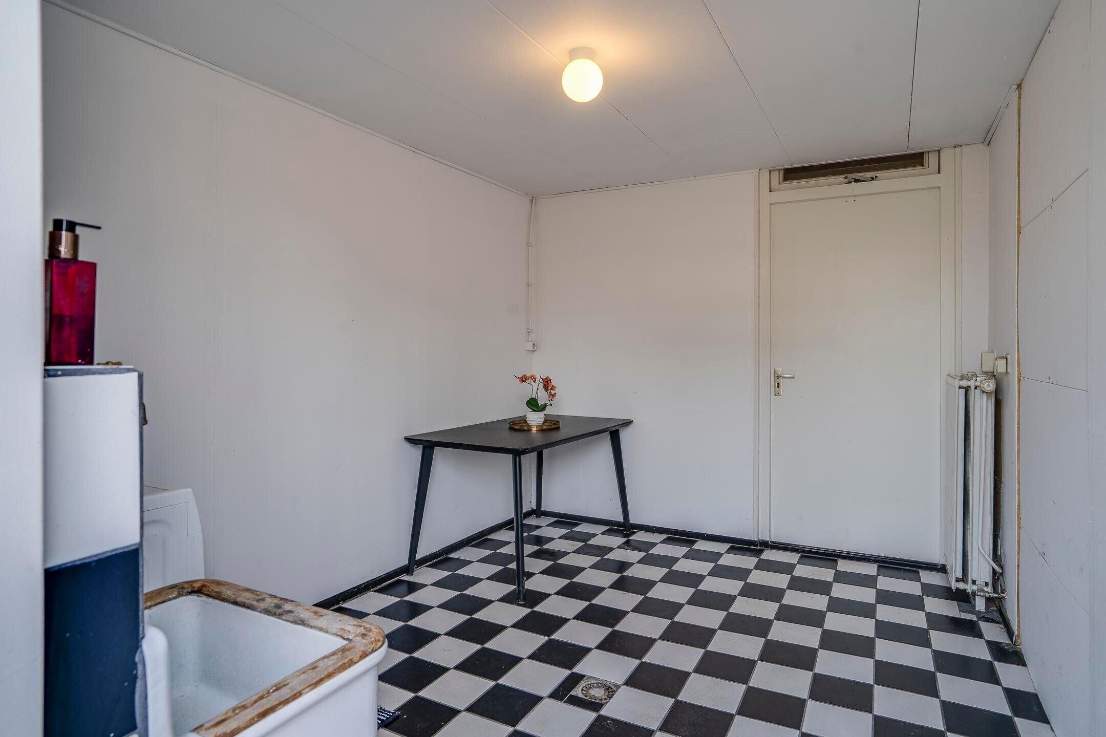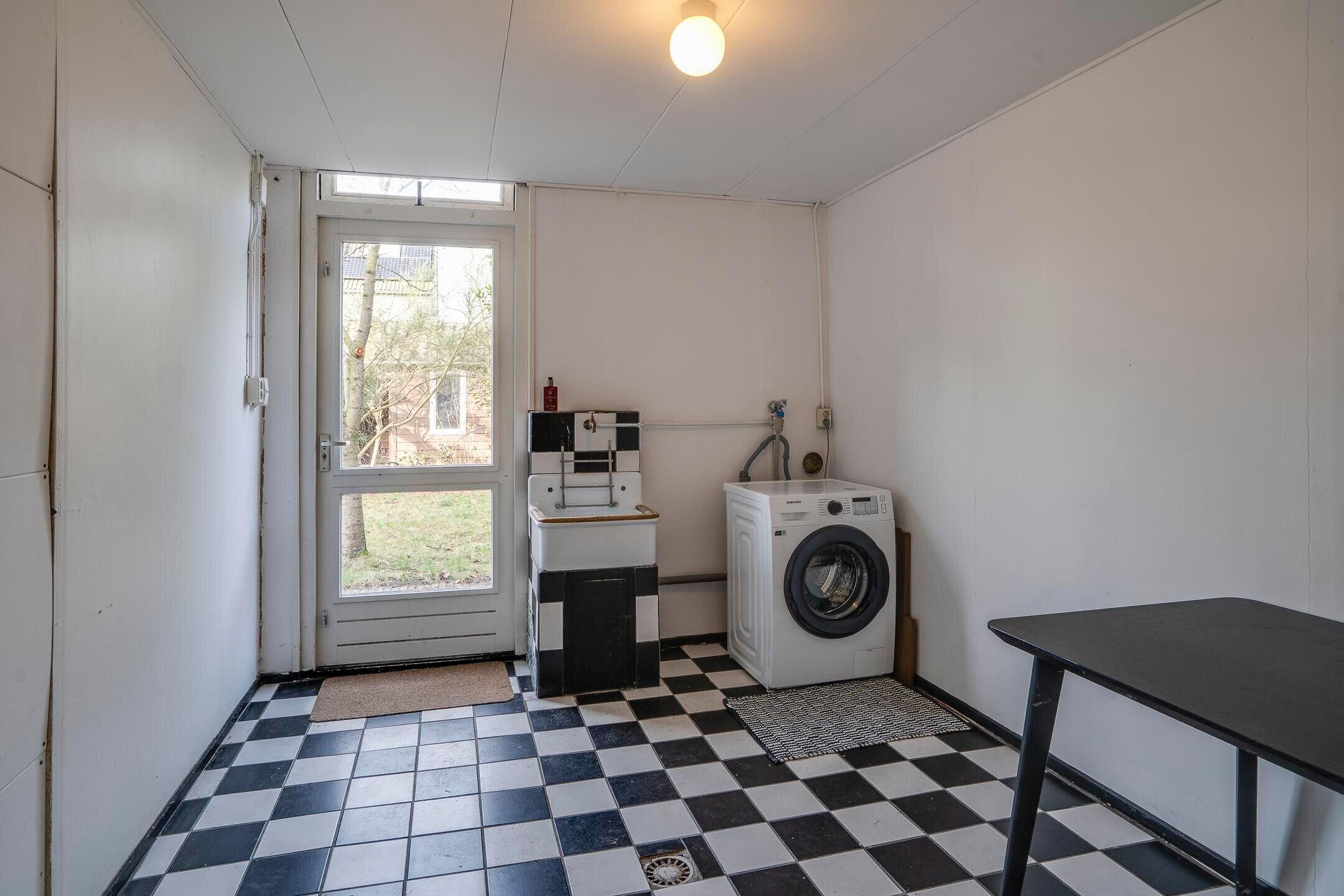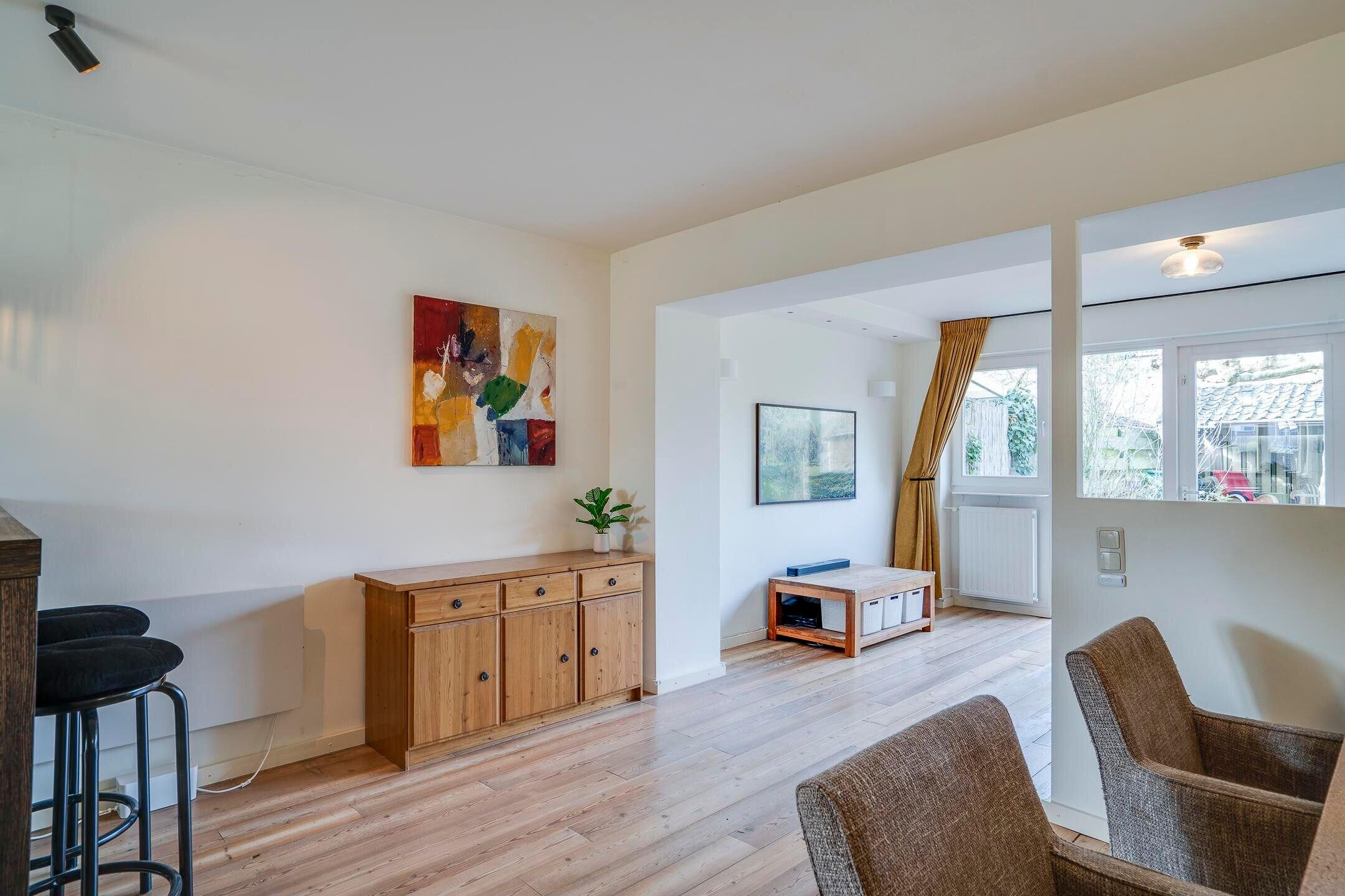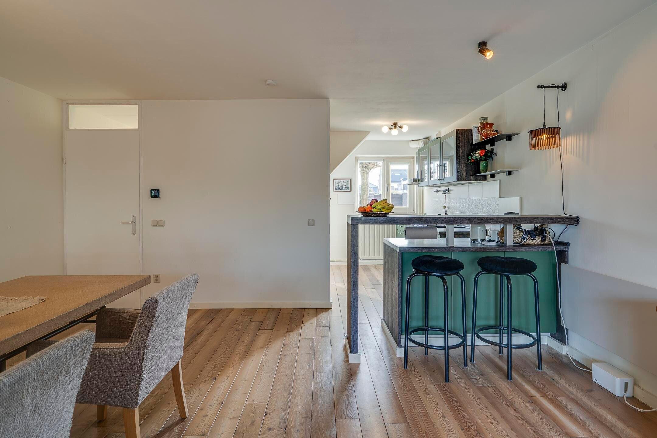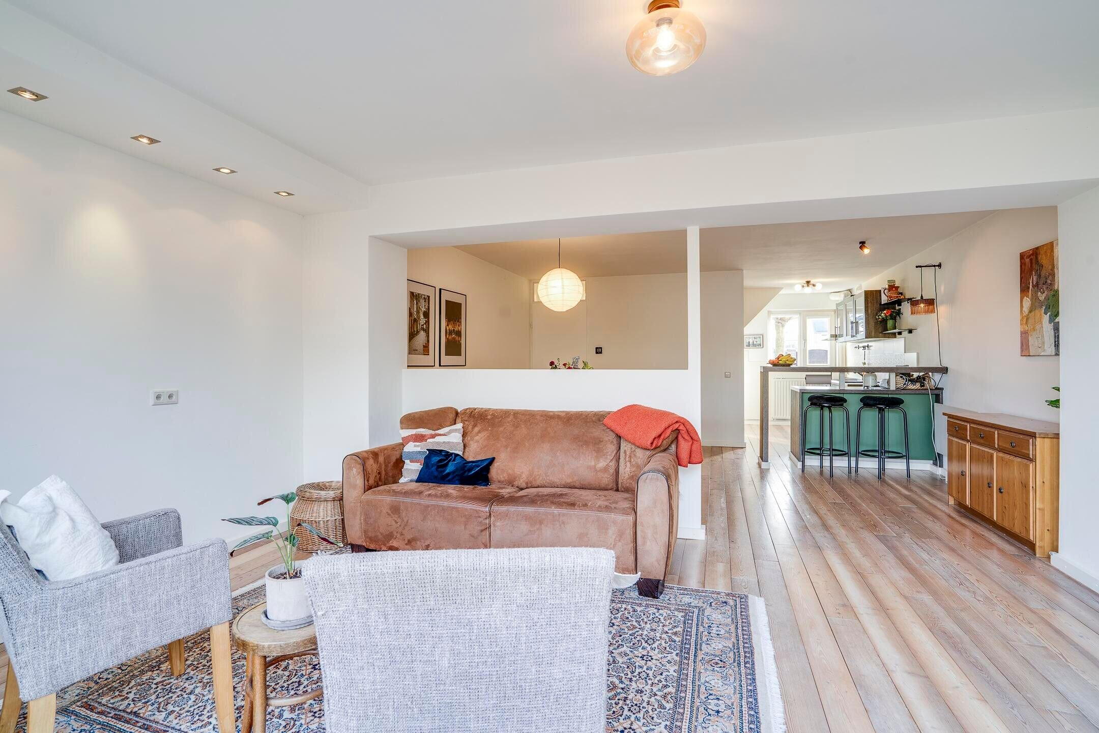 De woonkamer staat in open verbinding met de keuken. Daarnaast is er een bijkeuken / berging, die zorgt voor extra bergruimte en een directe doorgang naar de garage.