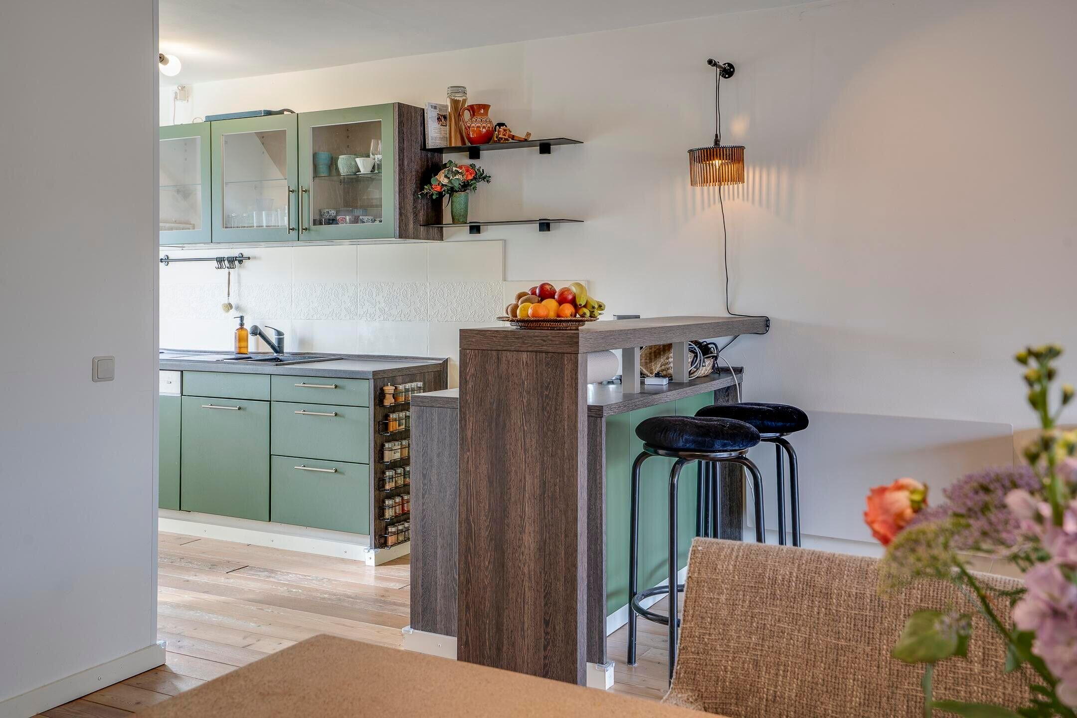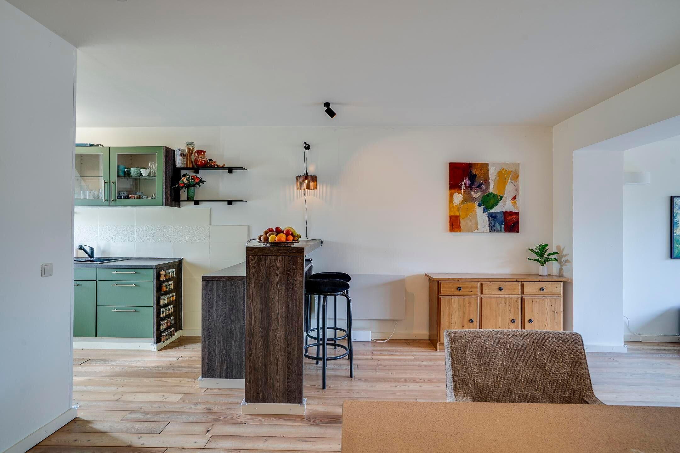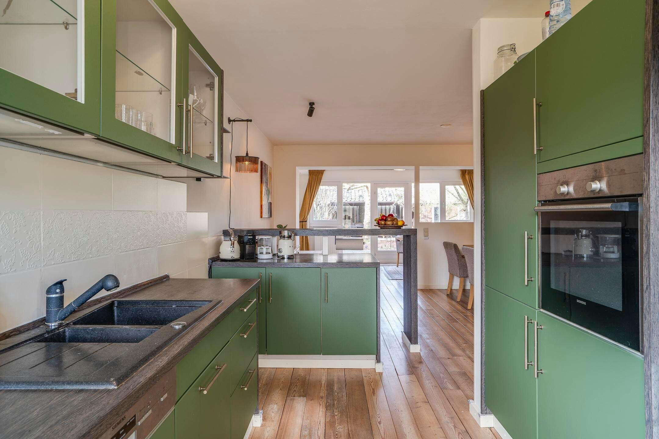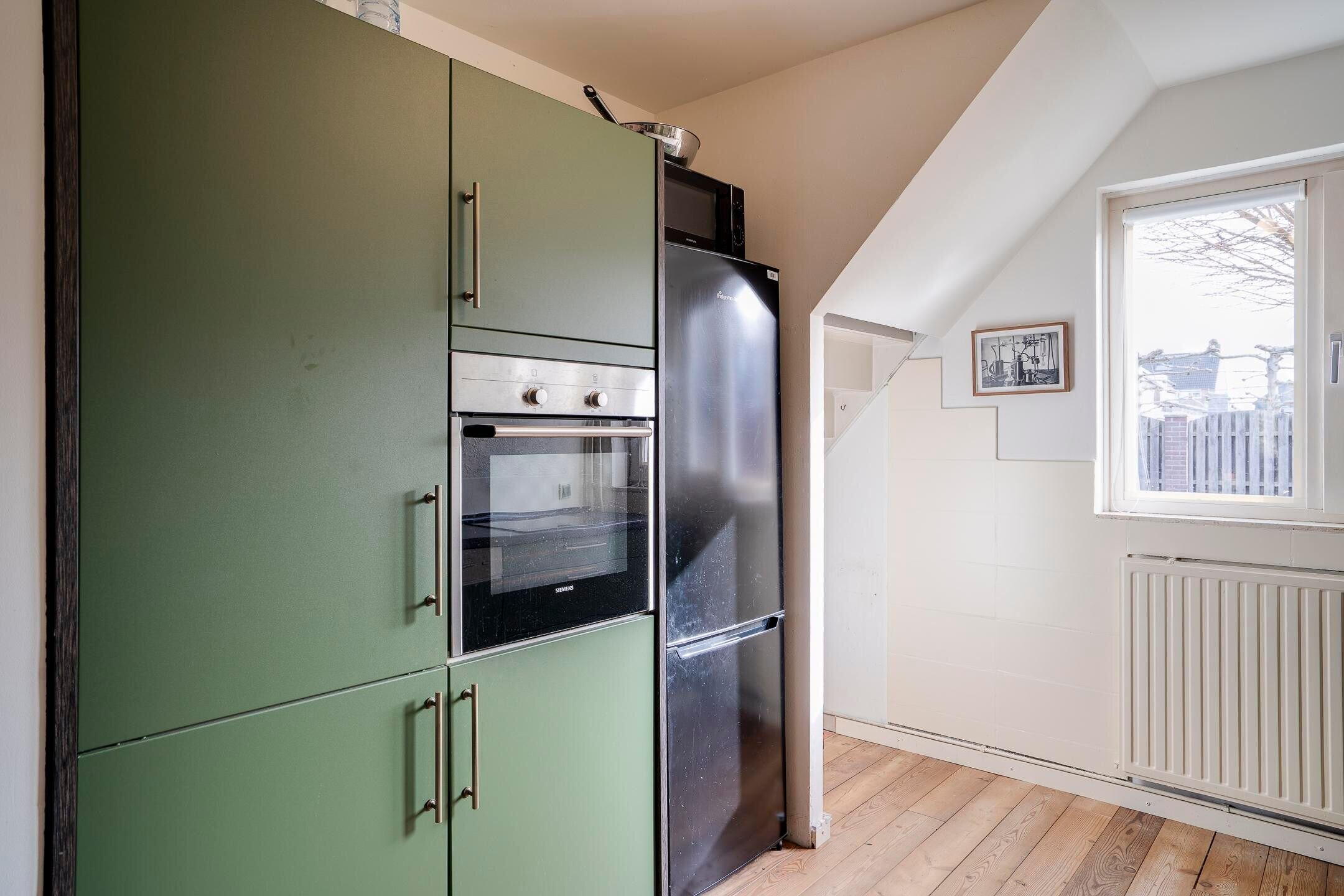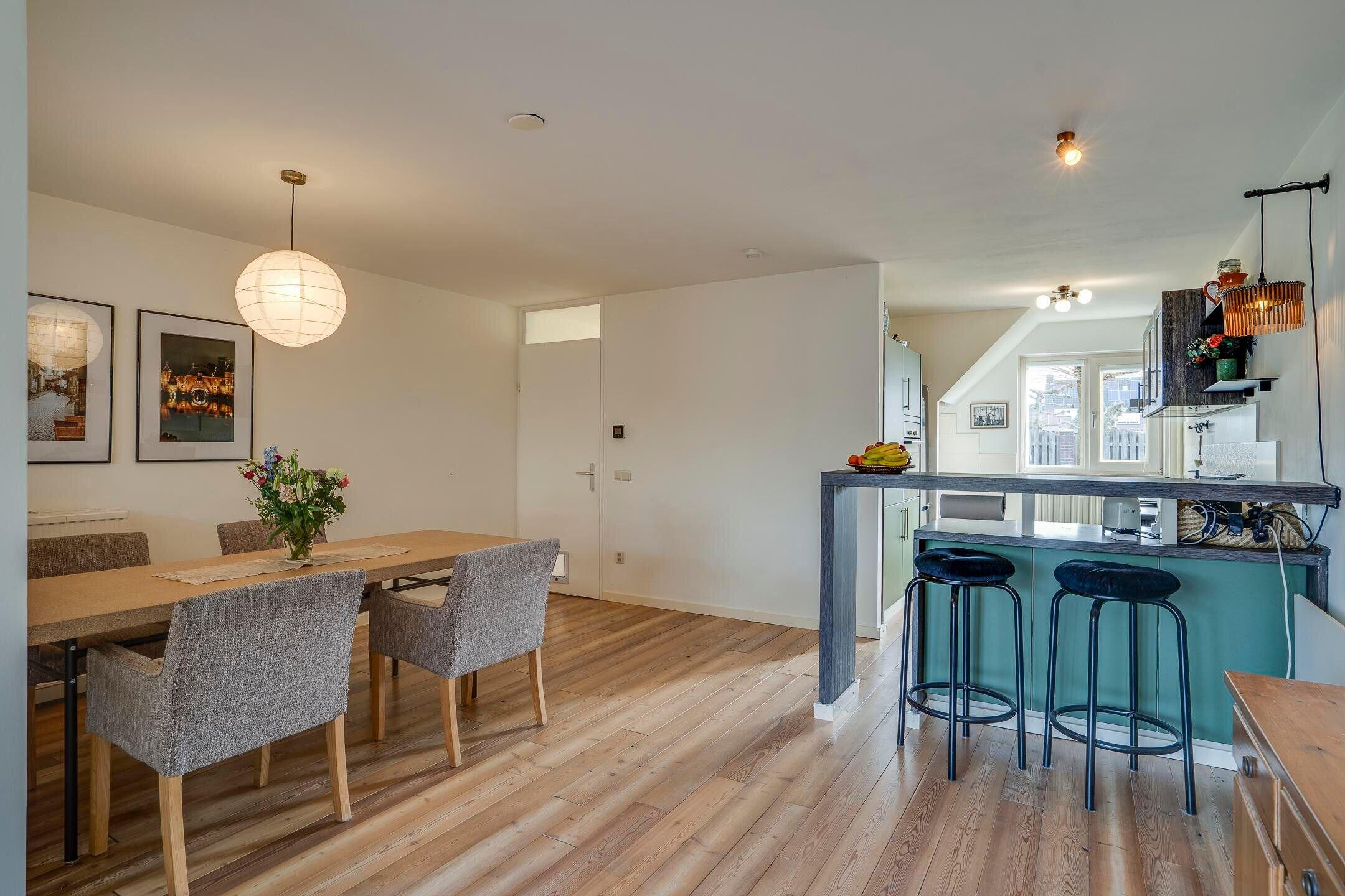 De woonkamer staat in open verbinding met de keuken. Daarnaast is er een bijkeuken / berging, die zorgt voor extra bergruimte en een directe doorgang naar de garage.