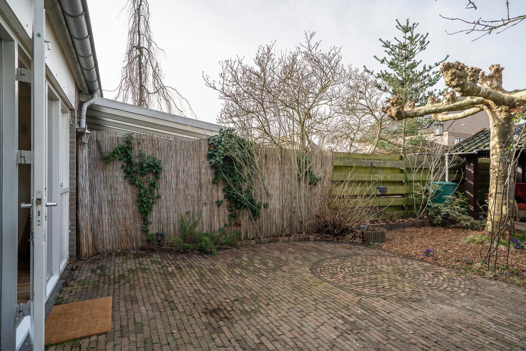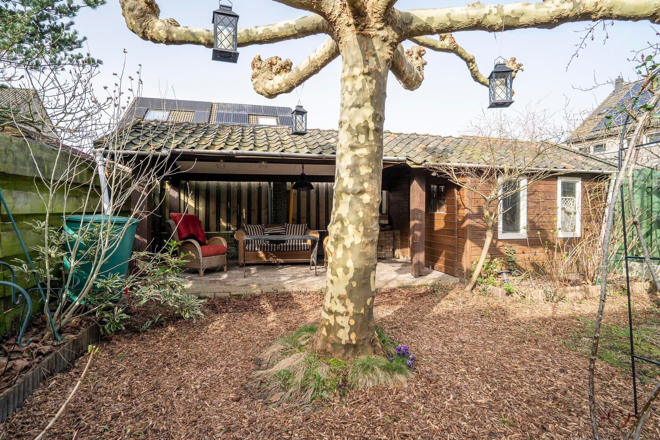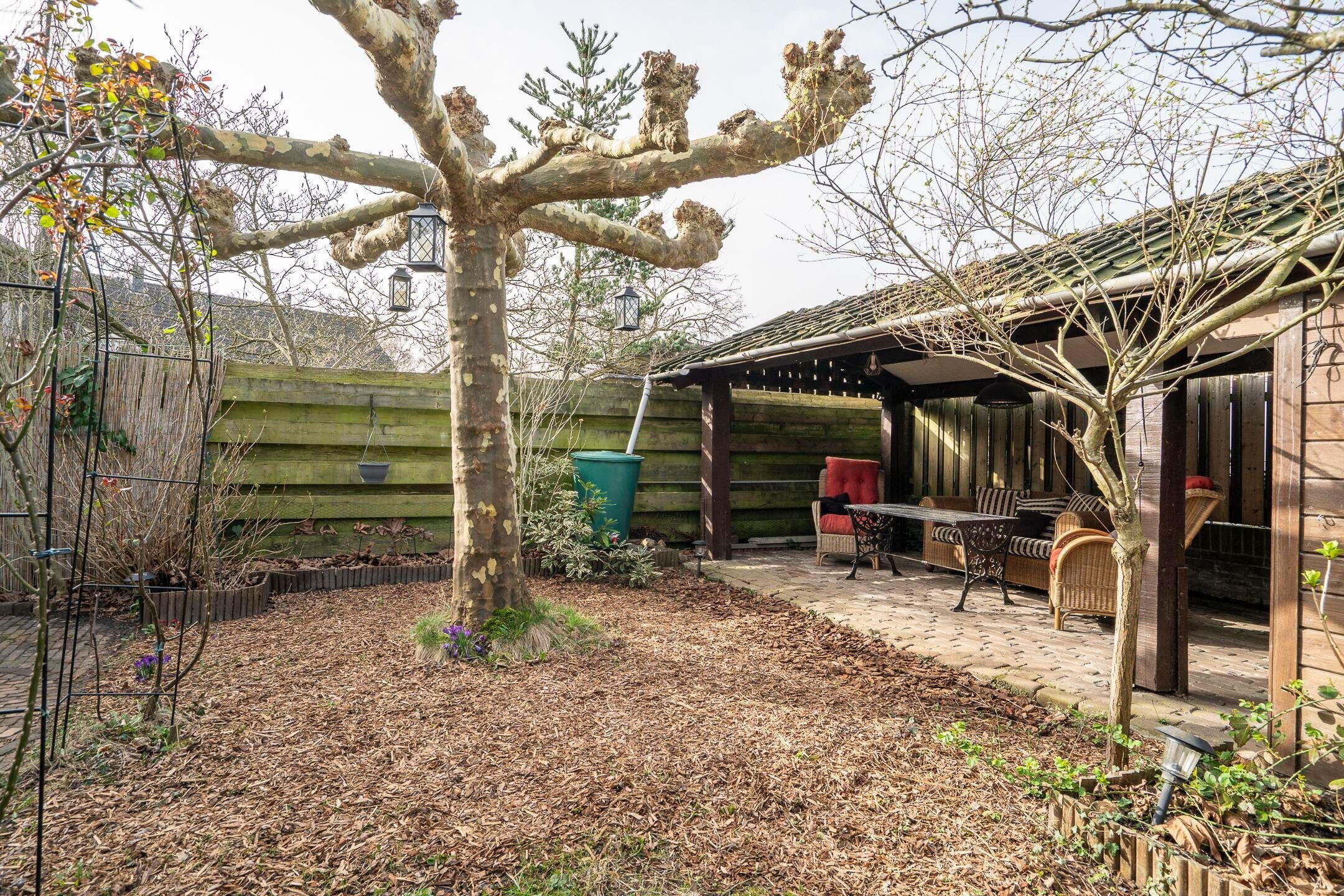 De achtertuin is gesitueerd op het westen, biedt veel privacy en heeft een vrije achterom. Naast de aangebouwde garage beschikt deze woning over een carport van 18 m² en een terrasoverkapping met tuinhuis (9 m²) voor opslag of stalling van fietsen.