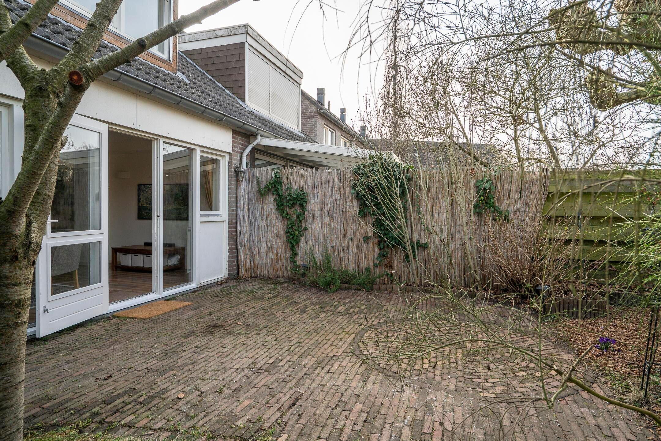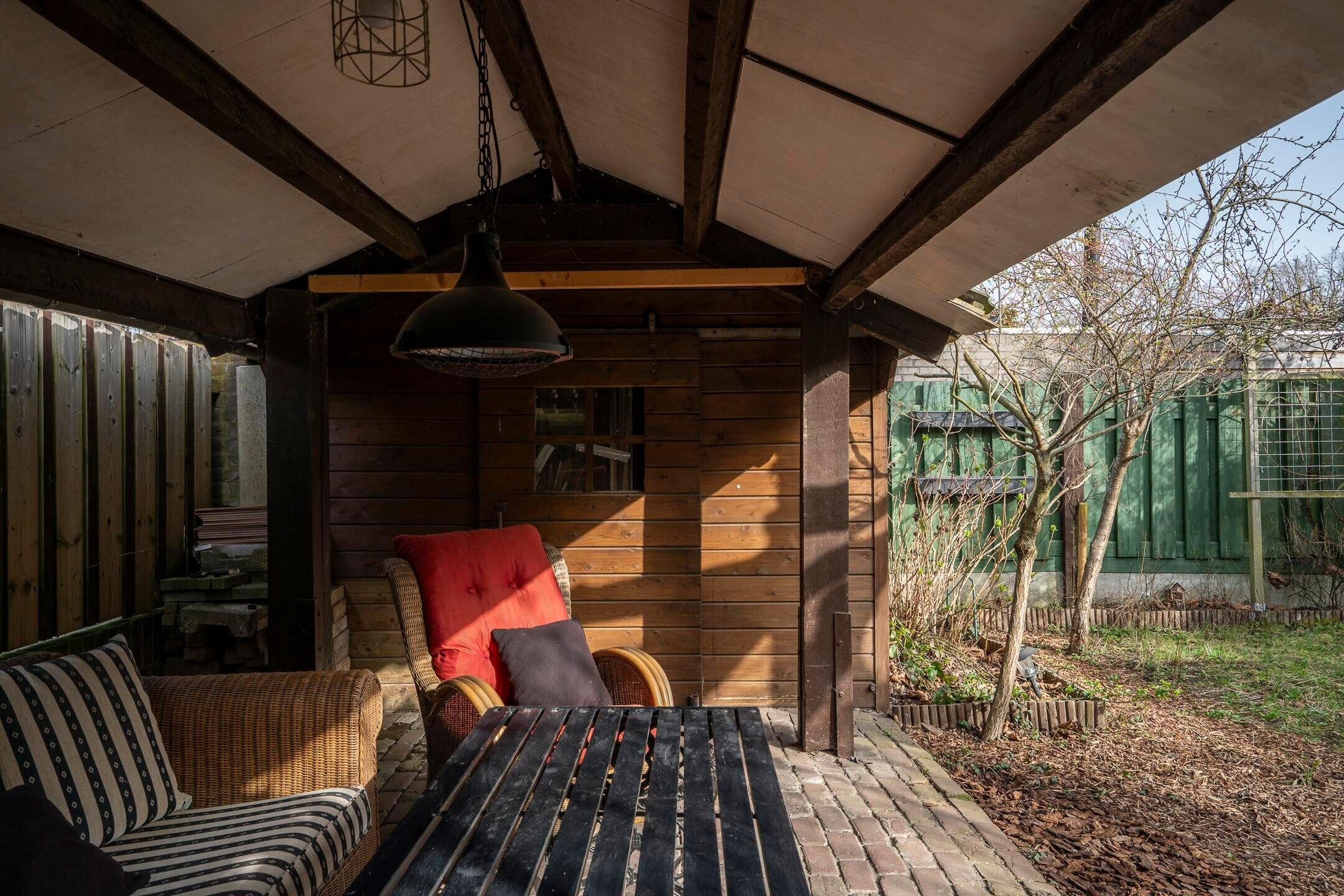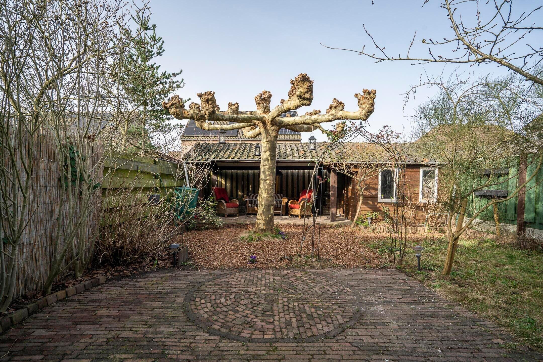 De achtertuin is gesitueerd op het westen, biedt veel privacy en heeft een vrije achterom. Naast de aangebouwde garage beschikt deze woning over een carport van 18 m² en een terrasoverkapping met tuinhuis (9 m²) voor opslag of stalling van fietsen.